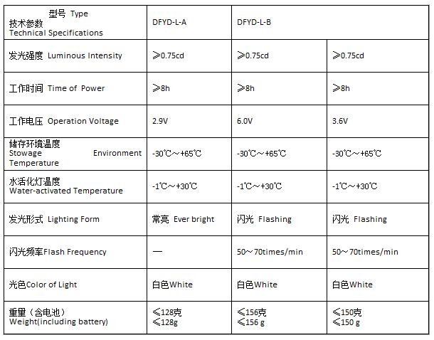 本公司生产的 DFYD-L-A 型锂电池救生衣灯(长亮), DFYD-L-B1 救生衣灯、 DFYD-L-B2 救生衣灯 DFYD-L-B (新型)救生衣灯 LG-3 型救生衣灯(闪亮)五种救生衣灯,均按照最新规范进行研制生产,其性能完全符合 1974 年 SOLAS 公约 2000 年修正案的要求。